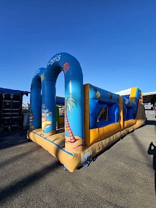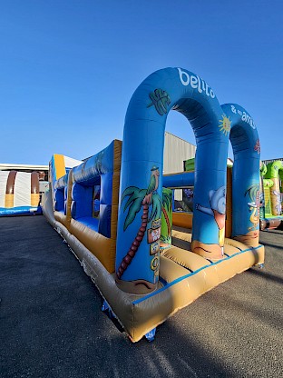 Aires et multiplays sur le theme MS VACANCES, jeux gonflable avec obstacles, anneaux, punching ball, quilles géantes suivant modèles SUR DEVIS GRATUIT.
