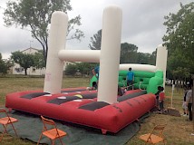 Structure gonflable occasion C2J loisirs en cours de nettoyage, aux normes EN14960. garantie 6 mois, nettoyée, vérifiée, et controle annuel, avec un dossier de conformités. Jeu gonflable aux couleurs de l'arc-en-ciel ! Un jeu d'opposition avec élastique pour amener un ballon de rugby le plus loin possible ! Idéal pour des manifestations sportives et pour animer une soirée à thème.