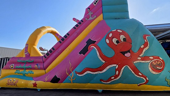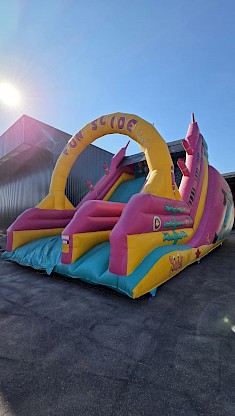 Jeu gonflable toboggan d'occasion en cours de nettoyage, aux normes EN14960. garanti 6 mois, nettoyé, vérifié, et controle annuel, avec un dossier de conformités.